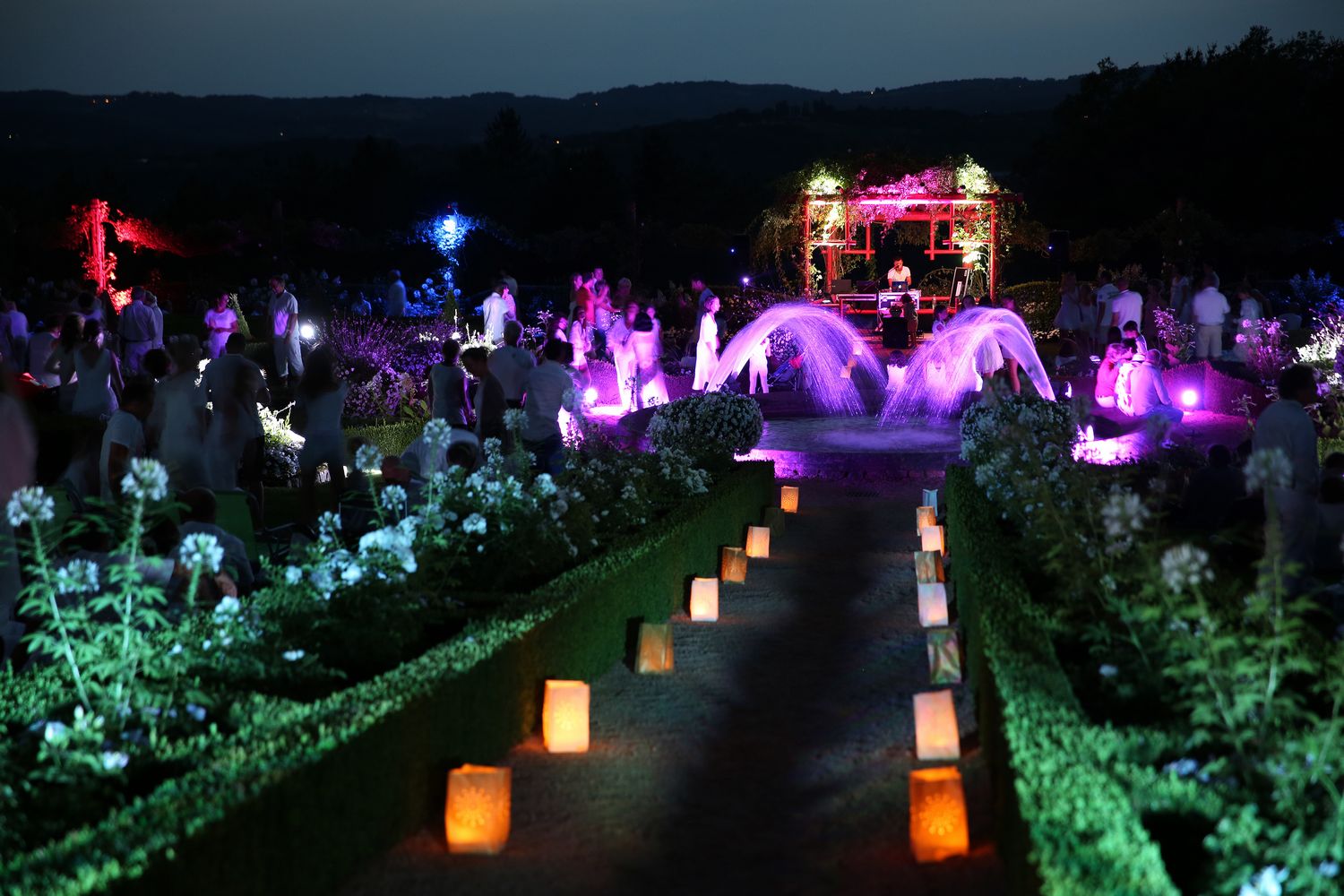 Ces pique-niques, dans le cadre romantique du jardin blanc, sont une véritable fête de plein air. Les participants ont exceptionnellement le droit de fouler les gazons de la Roseraie pour s’y installer et se régaler d’un délicieux panier repas avec le spectacle des collines de Dordogne face à eux. La musique est bien sûr au rendez-vous. D’abord fond musical pour le pique-nique, elle se fait ensuite plus présente pour entraîner les danseurs jusqu’au coucher du soleil. A la nuit tombée, le feu d’artifice est le point d’orgue de la soirée.
